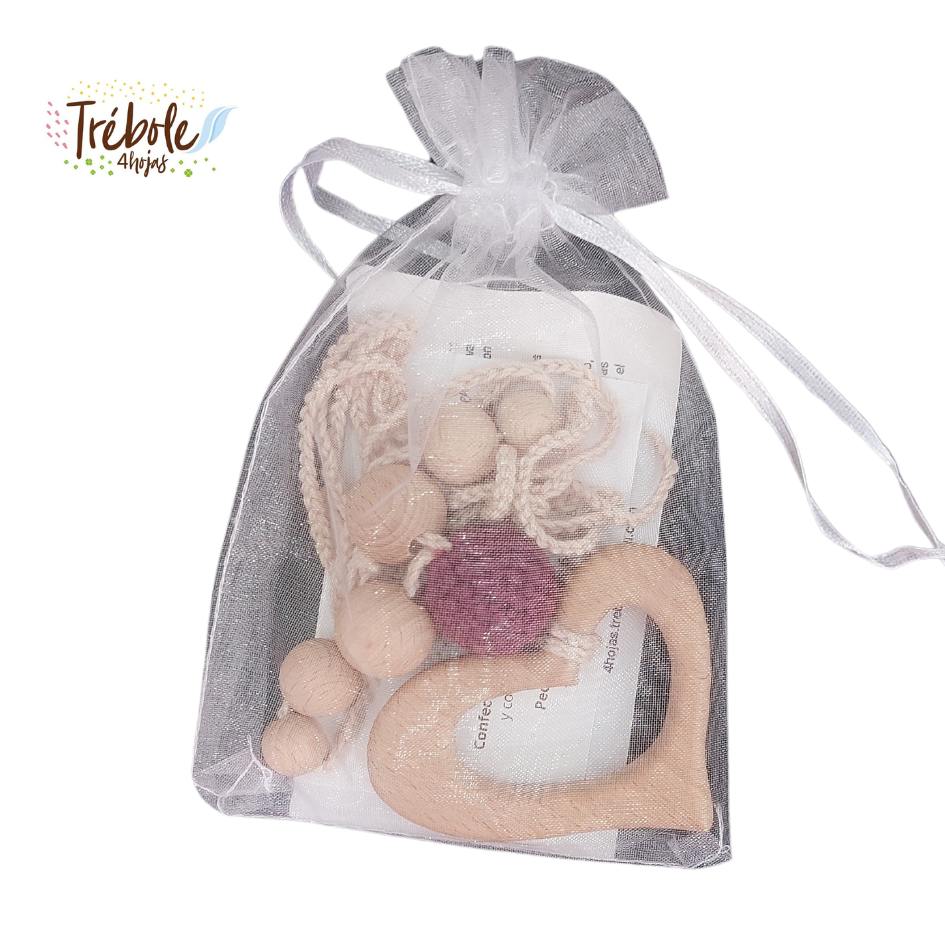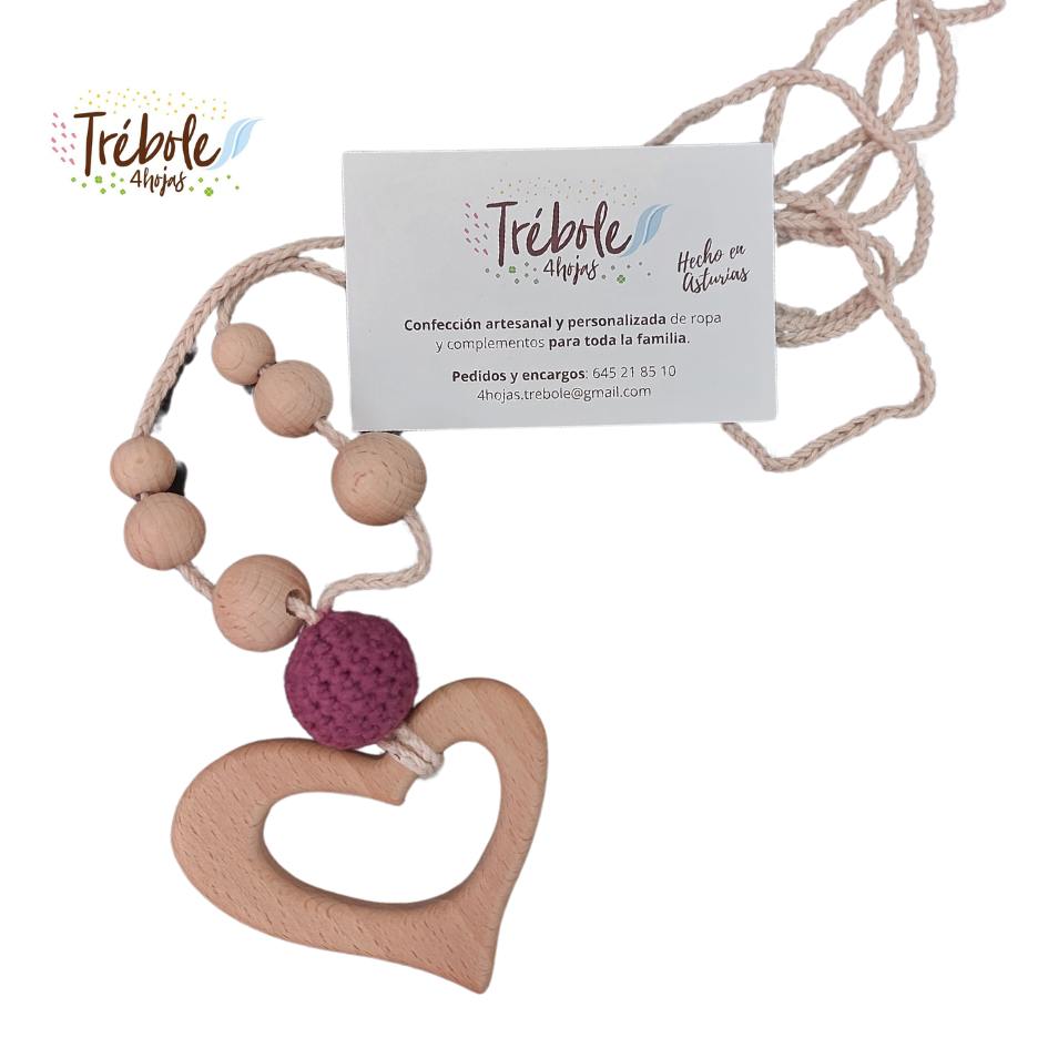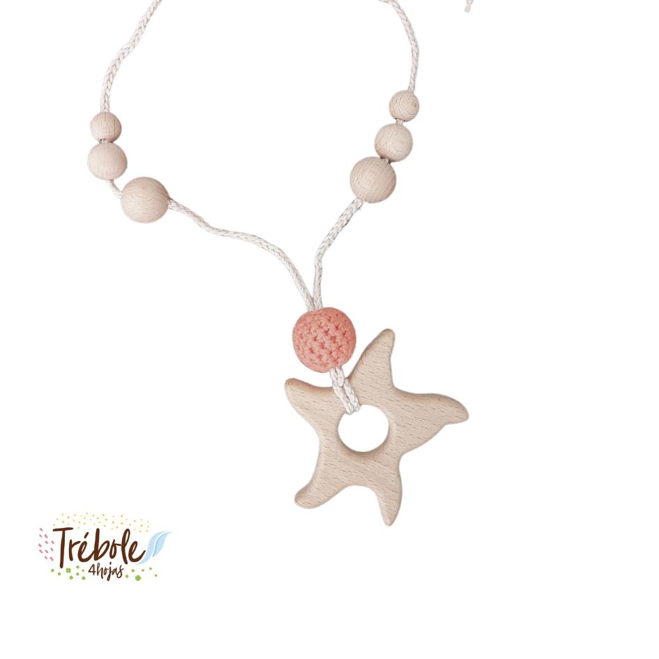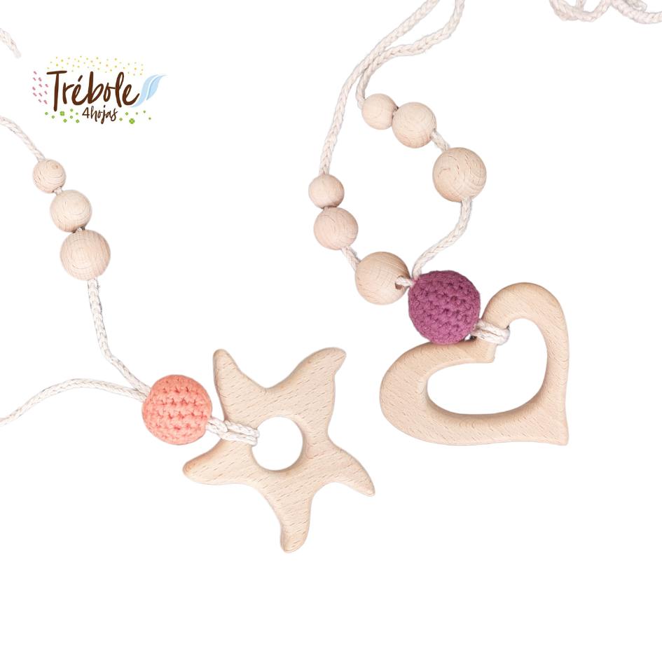 Collar de lactancia confeccionado por Trébole 4 Hojas con hilo de algodón orgánico y madera de pino bañada con aceite orgánico para